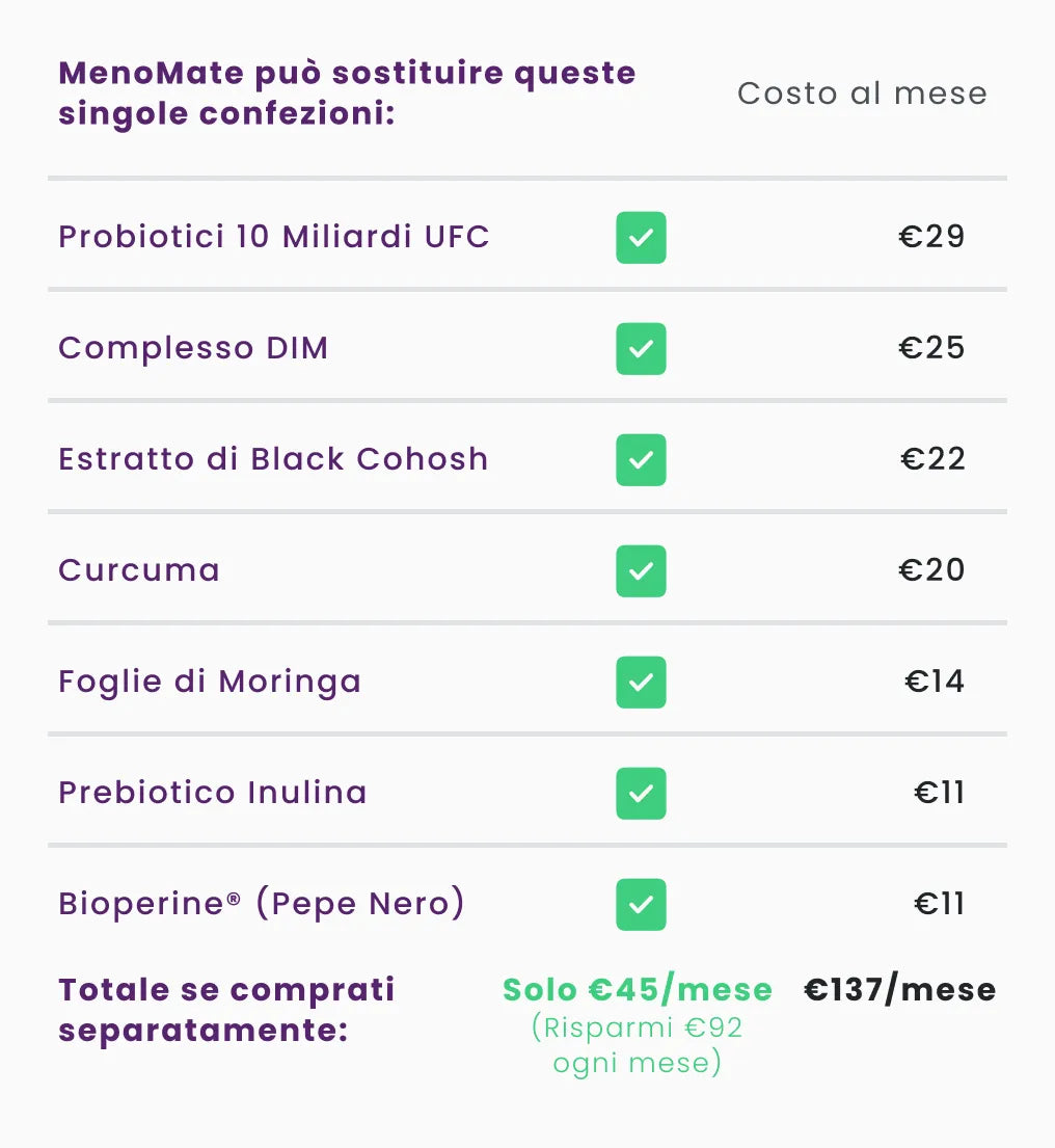 Se acquistassi ogni ingrediente di MenoMate separatamente alle dosi cliniche esatte che usiamo, ecco quanto pagheresti: