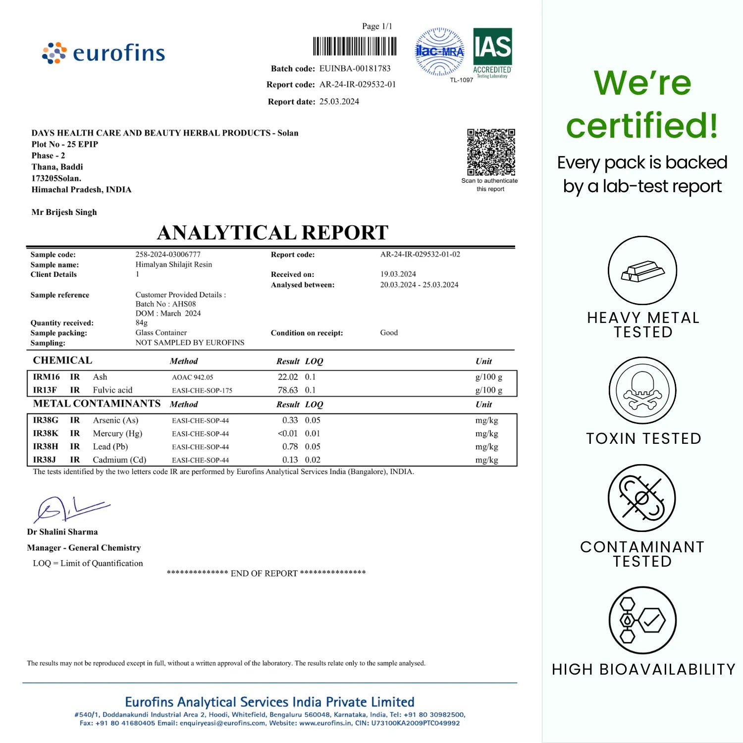 Our Shilajit is 3rd party, lab tested for purity and potency. It has 70% fulvic acid. It has a strong naturally earthy taste that we recommend you mix with warm water, or other liquids like warm milk.