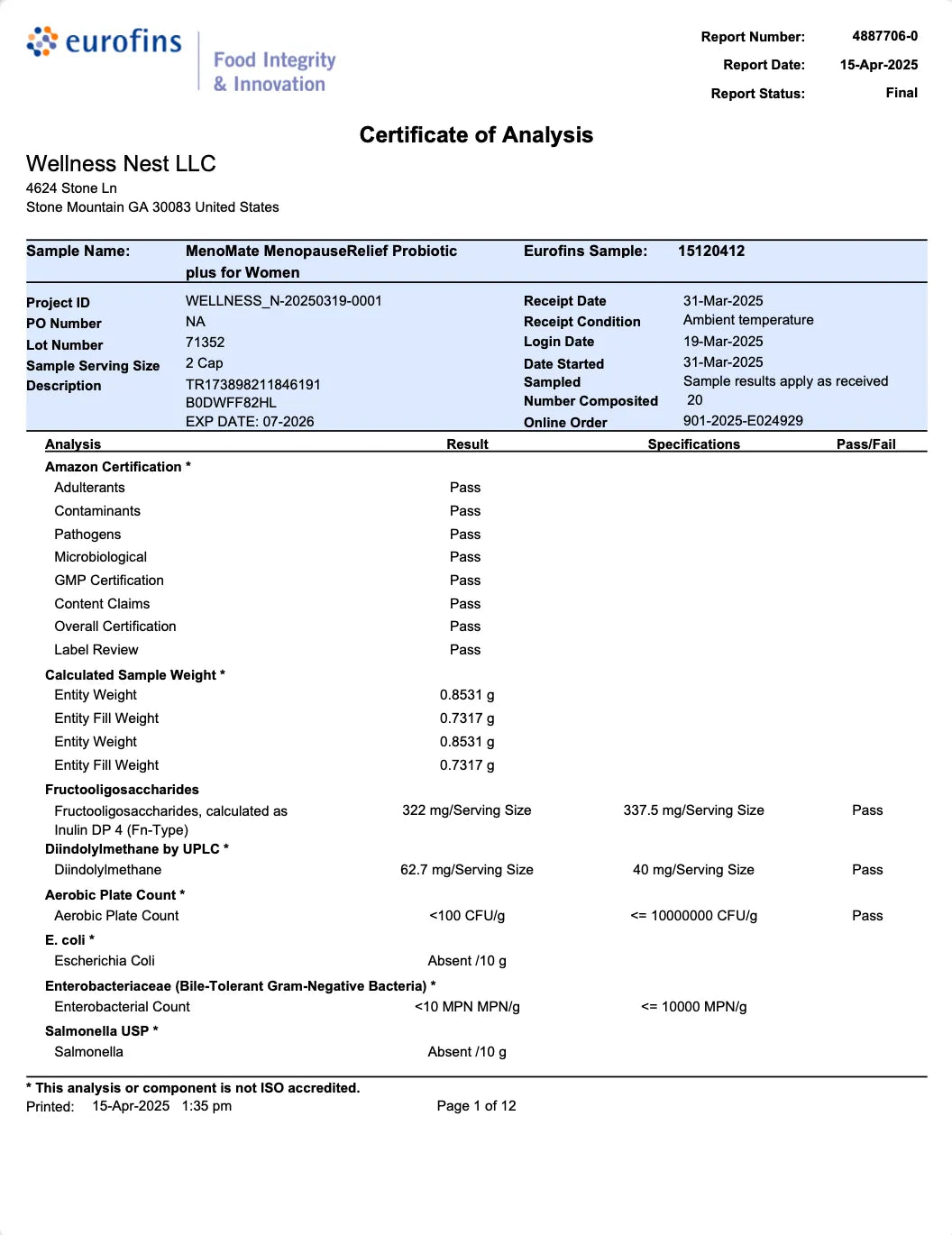 Every batch of MenoMate is verified by Eurofins (the global leader in pharmaceutical testing) with a Certificate of Analysis (CoA) to ensure: